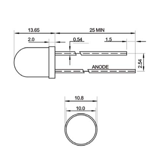 Поставка под заказ от 5000 шт. Выводной круглый светодиод, d=10 мм, прозрачная линза. Цвет свечения ультрафиолетовый (400 нм). Угол излучения 20°. Сила света Iv=1000-2000 мкд, If=20 мА. VF=3.8 В. Рекомендуемый постоянный рабочий ток <16-17 мА.