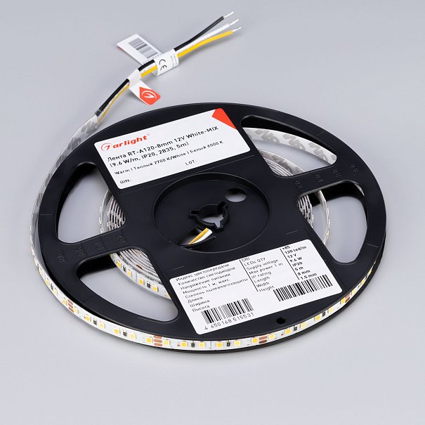 | 013126(2) | Светодиодная лента RT-A120-8mm 12V White-MIX (9.6 W/m, IP20, 2835, 5m) (Arlight, Изменяемая ЦТ) 120 led на 1м |