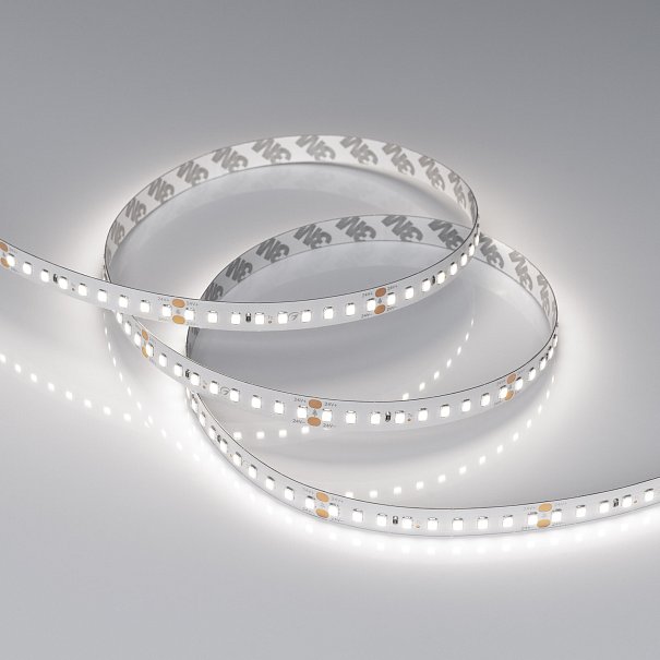 Светодиодная высокоэффективная лента RT серии A144. Светодиоды SMD 2835, 144 шт/м, белая плата шириной 10 мм, скотч 3M. Цвет БЕЛЫЙ 6000K, высокая световая эффективность 200 лм/Вт, индекс цветопередачи CRI>85, угол 120°. Питание 24 В, мощность 7.7 Вт/м (38.5 Вт на 5 м). Размеры 5000x10x1.6 мм. Мин. отрезок 62.5 мм, 9 светодиодов. Цена за 1 м.
