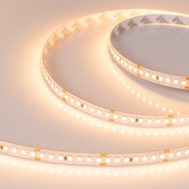 Светодиодная лента RT серии A168. Светодиоды SMD 2835, 168 шт/м, белая плата шириной 10 мм, скотч 3M. Цвет ТЕПЛЫЙ 3000K, индекс цветопередачи CRI>85, угол 120°. Питание 24 В, мощность 17 Вт/м (85 Вт на 5 м). Размеры 5000x10x1.5 мм. Мин. отрезок 41.67 мм, 7 светодиодов. Цена за 1 м.