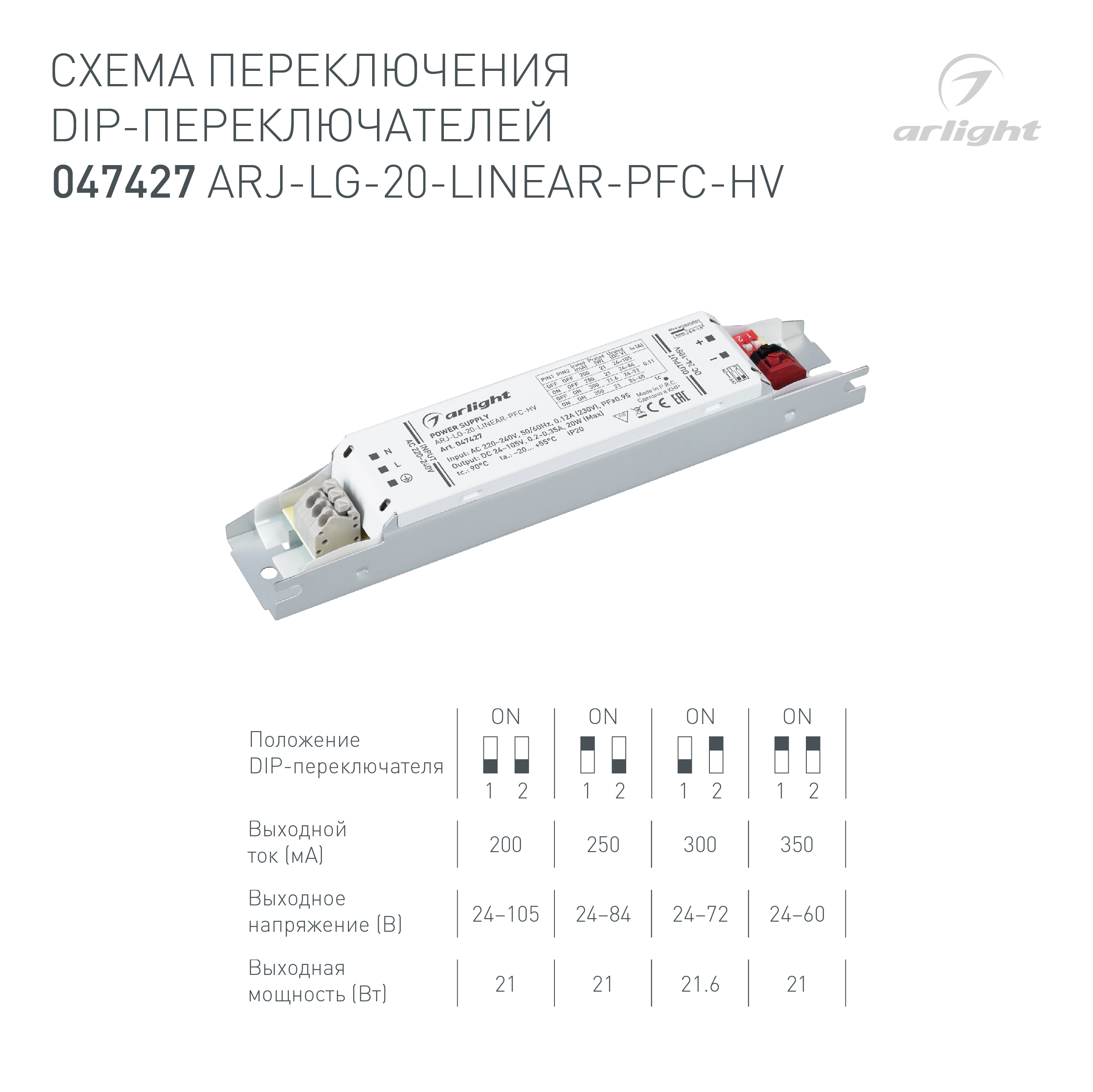 | 047427 | Блок питания ARJ-LG-20-LINEAR-PFC-HV (20W, 24-105V, 0.2-0.35A) (Arlight, IP20 Металл, 5 лет) |