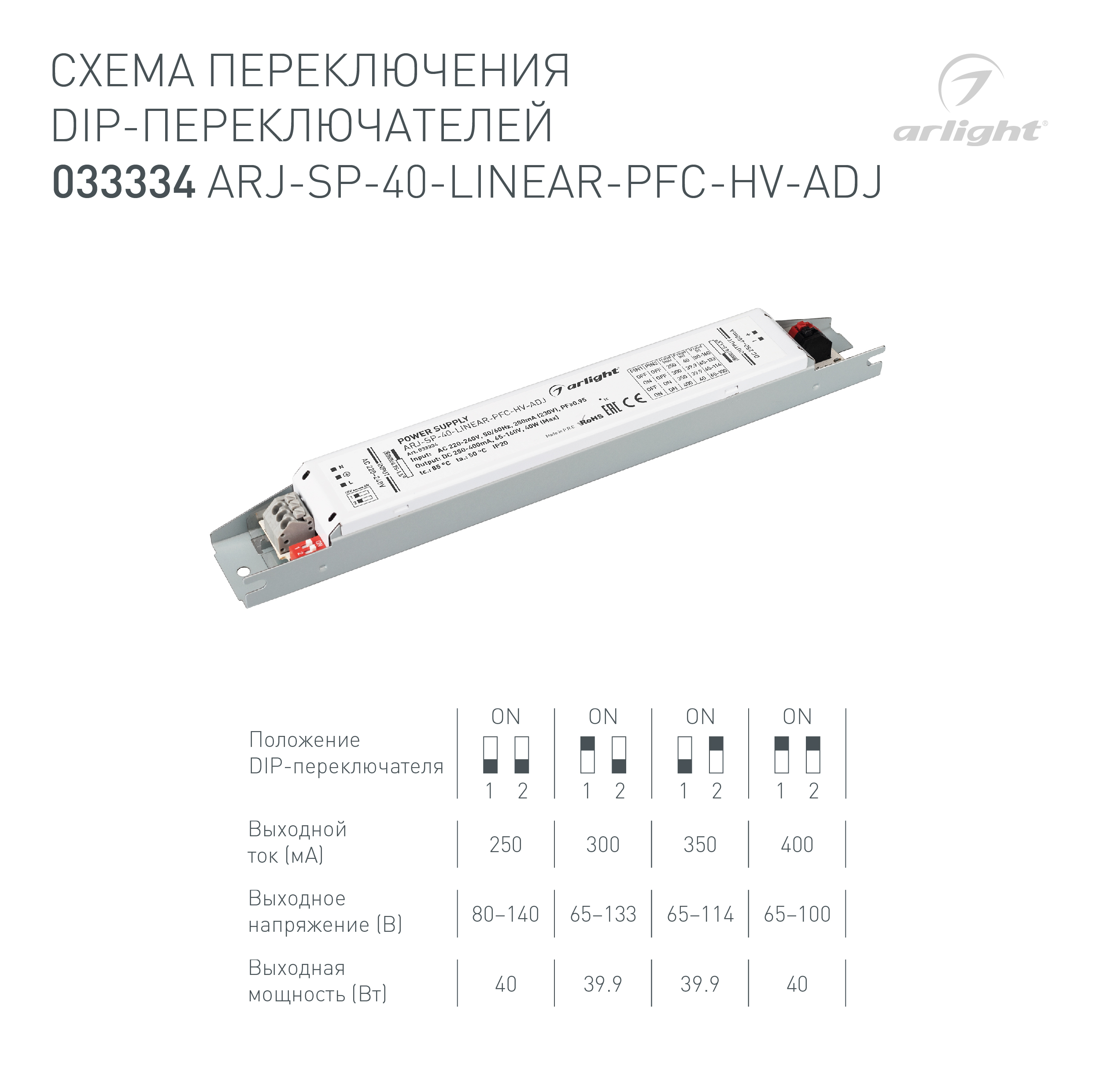 Блок питания ARJ-SP-40-LINEAR-PFC-HV-ADJ (40W, 250-400mA) (Arlight, IP20 Металл, 5 лет) - Артикул 033334