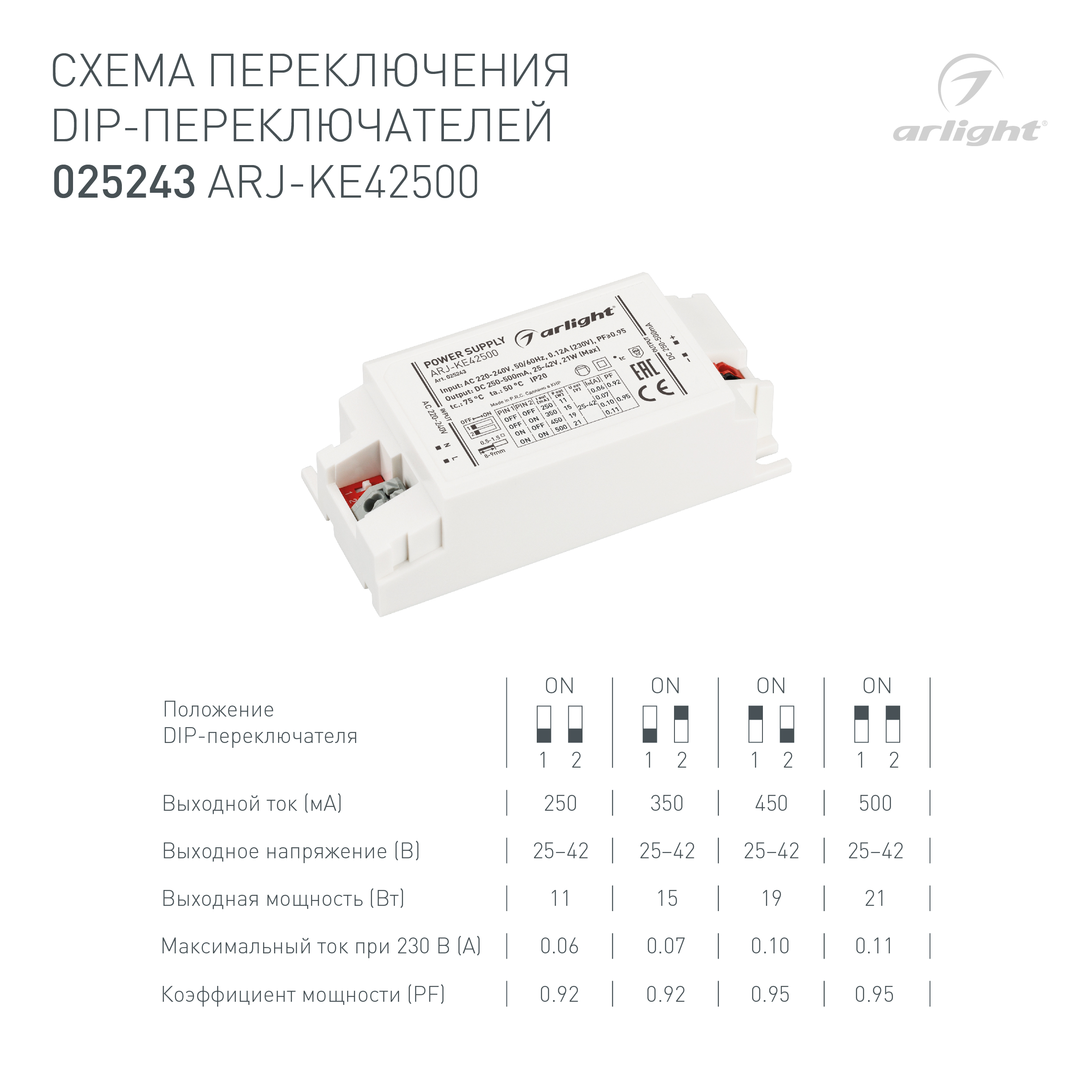 | 025243 | Блок питания ARJ-KE42500 (21W, 250-500mA, PFC) (Arlight, IP20 Пластик, 5 лет) |