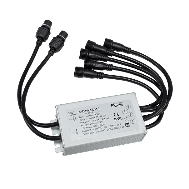 DMX PLC инжектор (коннектор питания) для подключения RGB гирлянд, управляемых по протоколу DMX512. Напряжение питания DC 24V. Вход: провод питания и сигнальный провод (DMX512). Выход: питание+DMX-PLC. Выходной порт - 5 шт. Поддерживает управление до 1000 RGB диодов.