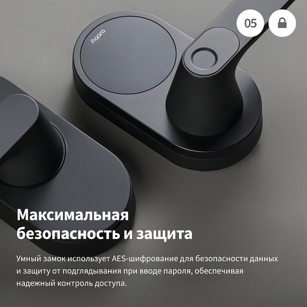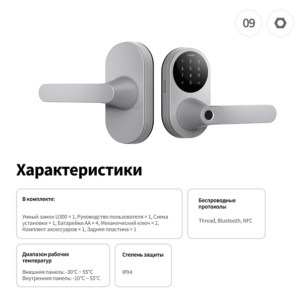 Aqara Smart Lock U300 — это умный замок для межкомнатных и входных дверей. Работает по протоколу Thread и поддерживает стандарт Matter. Открывается отпечатком пальца, паролем, NFC-меткой, механическим ключом или через Apple Home Key. Хранит до 50 отпечатков, разблокируется за 0,3 секунды. Питание от четырех батареек до 10 месяцев. Защита от влаги по стандарту IPX4, работает при температуре до -30°C.