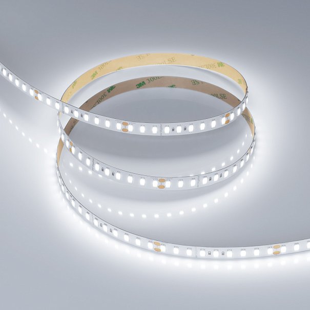 Светодиодная высокоэффективная лента ULTRA серии C126. Светодиоды SMD 5630, 126 шт/м, белая плата шириной 10 мм, скотч 3M. Цвет БЕЛЫЙ 6000K, высокая световая эффективность 200 лм/Вт, индекс цветопередачи CRI>80, угол 120°. Питание 24 В, мощность 14.4 Вт/м (72 Вт на 5 м). Размеры 5000x10x1.4 мм. Мин. отрезок 71.4 мм, 9 светодиодов. Цена за 1 м. Рекомендуется установка на профиль.