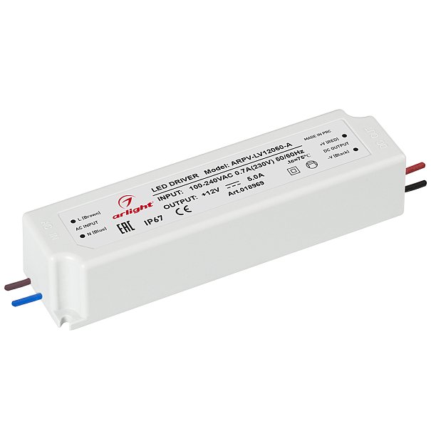 Источник напряжения с гальванической развязкой для светодиодных изделий. Входное напряжение 100-240 VAC. Выходные параметры: 12 В, 5 А, 60 Вт. Встроенный PFC >0,5. Герметичный пластиковый корпус IP 67. Рабочая температура -20…+50C⁰. Габаритные размеры длина 162 мм, ширина 42 мм, высота 34 мм. Гарантийный срок 3 года.