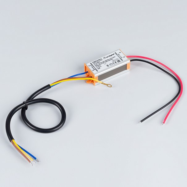 Источник тока с гальванической развязкой для уличных светильников и мощных светодиодов. Входное напряжение 100-240 VAC. Выходные параметры: 21-40 В, 350 mА, 12 Вт. PF >0.5. Герметичный металлический корпус IP 65. Габаритные размеры длина 68 мм, ширина 30 мм, высота 20 мм. Гарантийный срок 3 года.