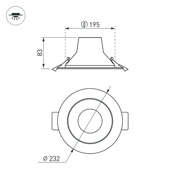 Светильник даунлайт с изменяемой цветовой температурой и переключателем на корпусе. Мощность 35 Вт, св. поток 4038-4230 лм, 106 лм/Вт, белый 6000К, или дневной 4000К, или теплый 3000К (выбор цвета свечения при установке, фиксированный), CRI>80, угол 80°, напряжение питания 230 В. Белый круглый корпус из алюминия, степень защиты IP20. Размер: диаметр 232 мм, высота 83 мм. Монтаж встраиваемый, установочное отверстие: диаметр 195-210 мм. Драйвер 26,5-44,5 В, 900 мА, пульсация <0,7%.