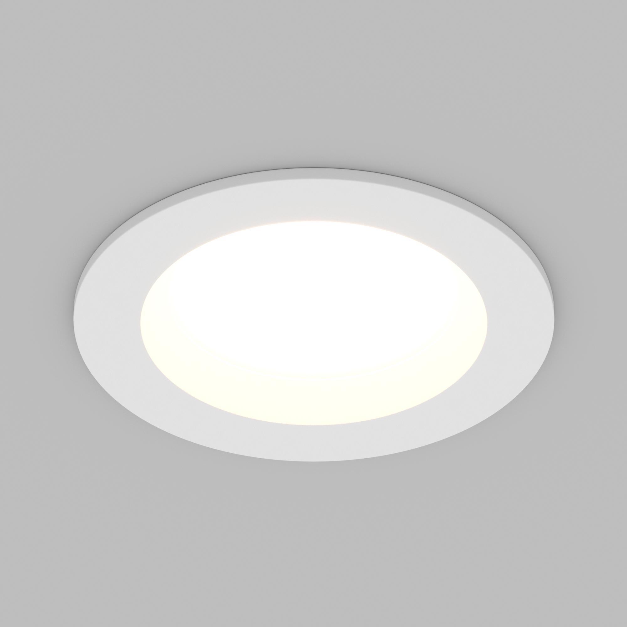 Встраиваемый светильник даунлайт. Мощность 9 Вт, св. поток 555 лм, 62 лм/Вт, тёплый 3000 K, CRI>90, угол 110°, напряжение питания 230 В. Белый круглый корпус из алюминия, экран PMMA, степень защиты IP54. Размер: диаметр 105 мм, высота 55 мм. Монтаж встраиваемый, установочное отверстие: диаметр 95 мм. Драйвер IP54, 30-45 В, 200 мА, пульсация <3%.