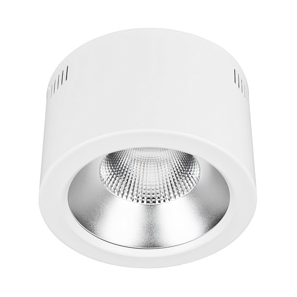 Накладной интерьерный светильник. Мощность 35 Вт, св. поток 2870 лм, 82 лм/Вт, теплый 3000К, CRI>80, угол 50°, напряжение питания 230 В. Белый круглый корпус из алюминия. Степень защиты IP20. Размер: Ø235х160мм. Монтаж накладной. Питание AC220-240V. Драйвер в комплекте (26.5-44.5V, 900mA).