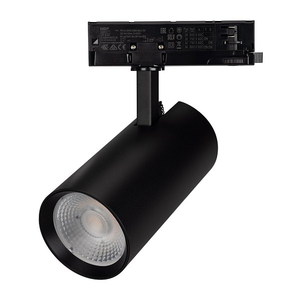 Светильник для треков/шин 4 провода. Мощность 30 Вт, св. поток без решетки honeycomb 3000 лм, 100 лм/Вт, с решеткой honeycomb 1980 лм, 66 лм/Вт, дневной 4000 K, CRI>90, угол 55°, напряжение питания 230 В. Черный круглый корпус из алюминия, материал линзы PMMA, степень защиты IP20. Размер: диаметр 90 мм, длина световой части 141 мм. Монтаж на трек 3-фазный. Драйвер встроенный 24-42 В, 750мА., пульсация <5%