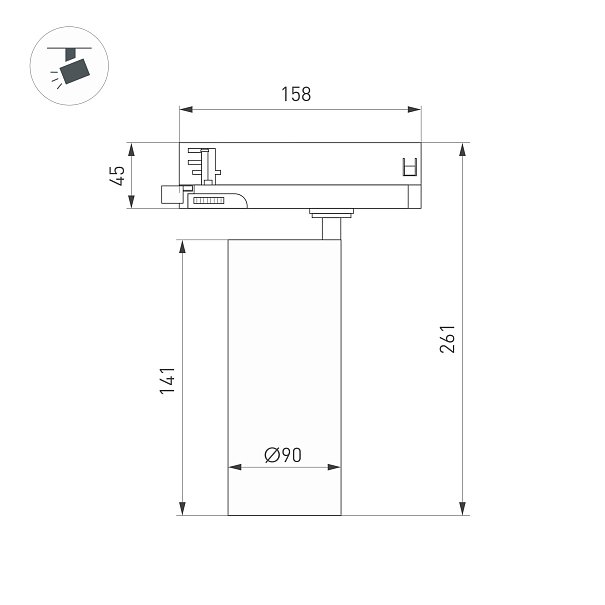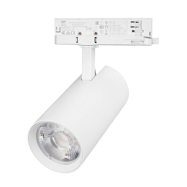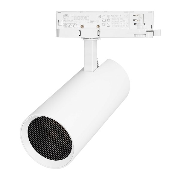 Светильник для треков/шин 4 провода. Мощность 40Вт, св. поток без решетки honeycomb 4000 лм, 100 лм/Вт, с решеткой honeycomb 2640 лм, 66 лм/Вт, дневной 4000 K, CRI>90, угол 15°, напряжение питания 230 В. Белый круглый корпус из алюминия, материал линзы PMMA, степень защиты IP20. Размер: диаметр 90 мм, длина световой части 141 мм. Монтаж на трек 3-фазный. Драйвер встроенный 24-42 В, 750мА., пульсация <5%
