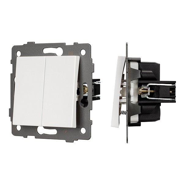 Механизм выключателя света клавишный на 1 пост 2 возвратные клавиши. Цвет - белый. Без фронтальной рамки. Уровень пылевлагозащиты IP20. Выключатель устанавливается в стандартный круглый подрозетник. Габаритные размеры: длина 71 мм, ширина 71 мм, высота 52 мм. Гарантийный срок 10 лет.
