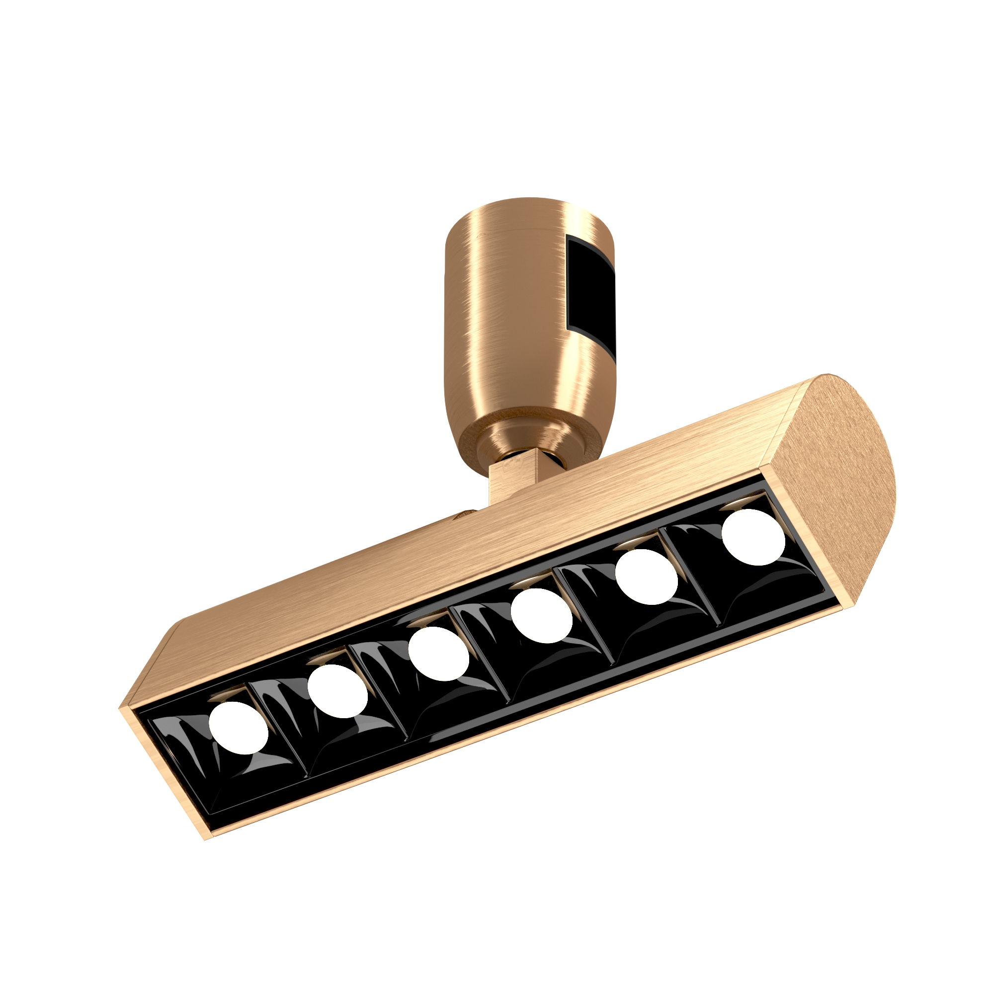 Светильник поворотный для треков APRIORI шириной 17 мм. Мощность 8 Вт, св. поток 395 лм, 49 лм/Вт, теплый 3000 K, CRI>90, угол 48°, напряжение питания 48 В. Линейный корпус из алюминия, гальванизированного в цвет светлое золото, степень защиты IP20. Размер: длина 165,5 мм, ширина 38 мм, высота 125 мм. Монтаж на трек APRIORI 17 мм. Пульсация <1%. Возможно диммирование по ШИМ (PWM) или не адресное управление при использовании диммируемого драйвера Dali, 0-10V, TRIAC.