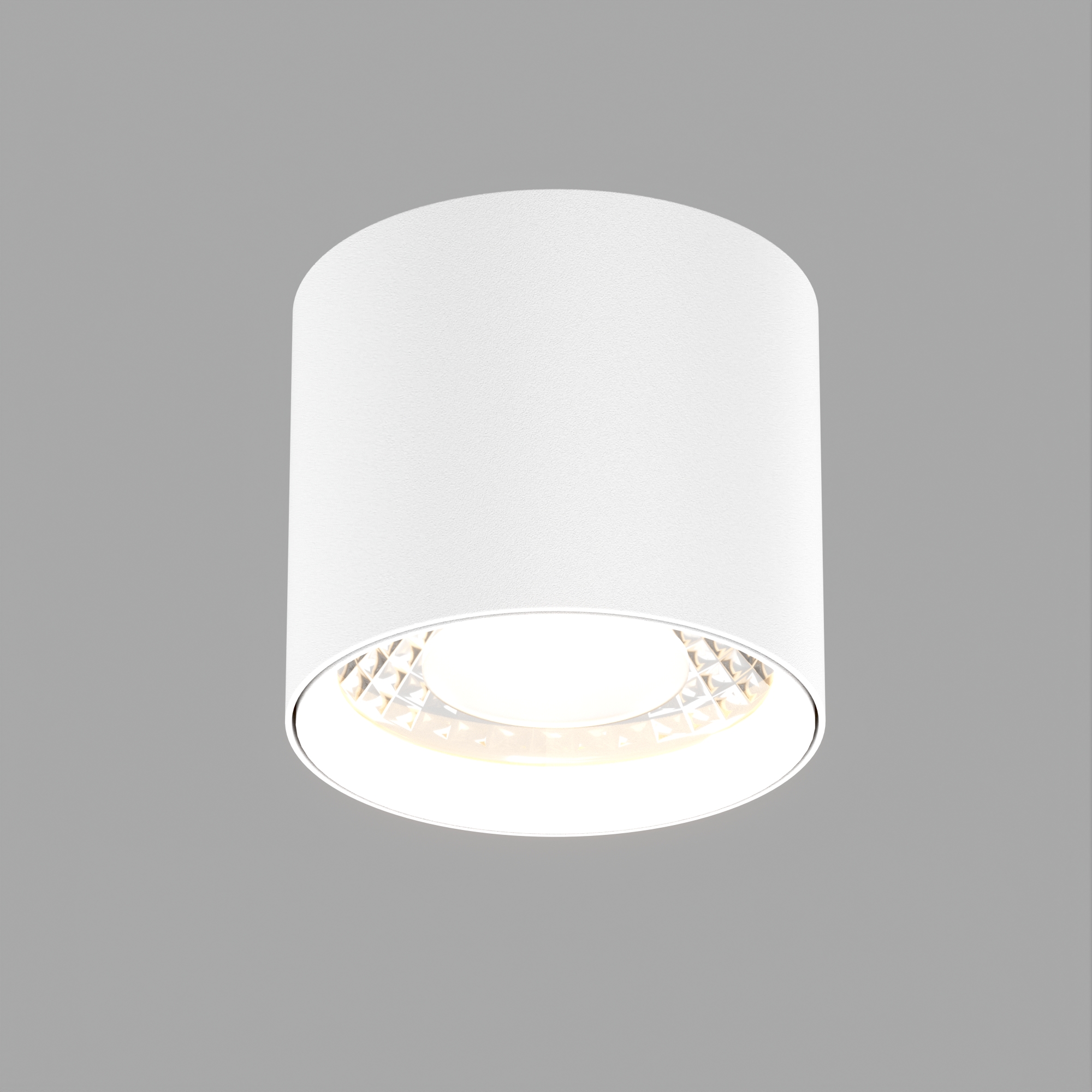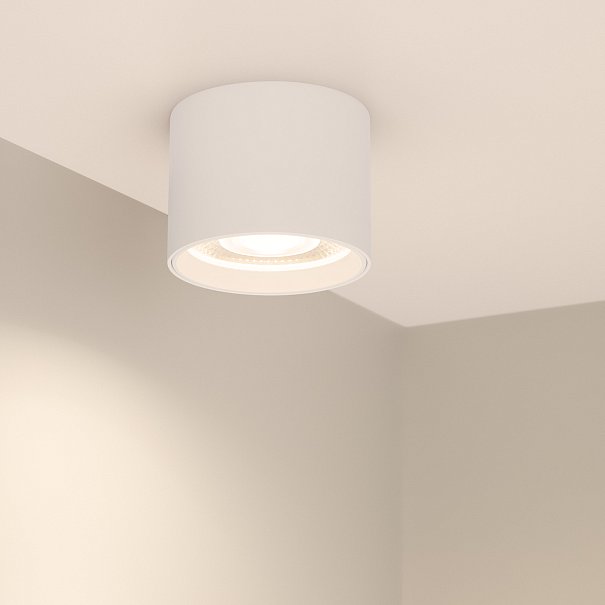 Накладной интерьерный светильник. Мощность 10 Вт, св. поток 780 лм, 78 лм/Вт, теплый 3000 K, CRI>90, угол 24°, напряжение питания 230 В. Белый круглый корпус, степень защиты IP54. Размер: диаметр 77 мм, высота 65 мм. Монтаж накладной. Драйвер встроенный, пульсация <5 %.