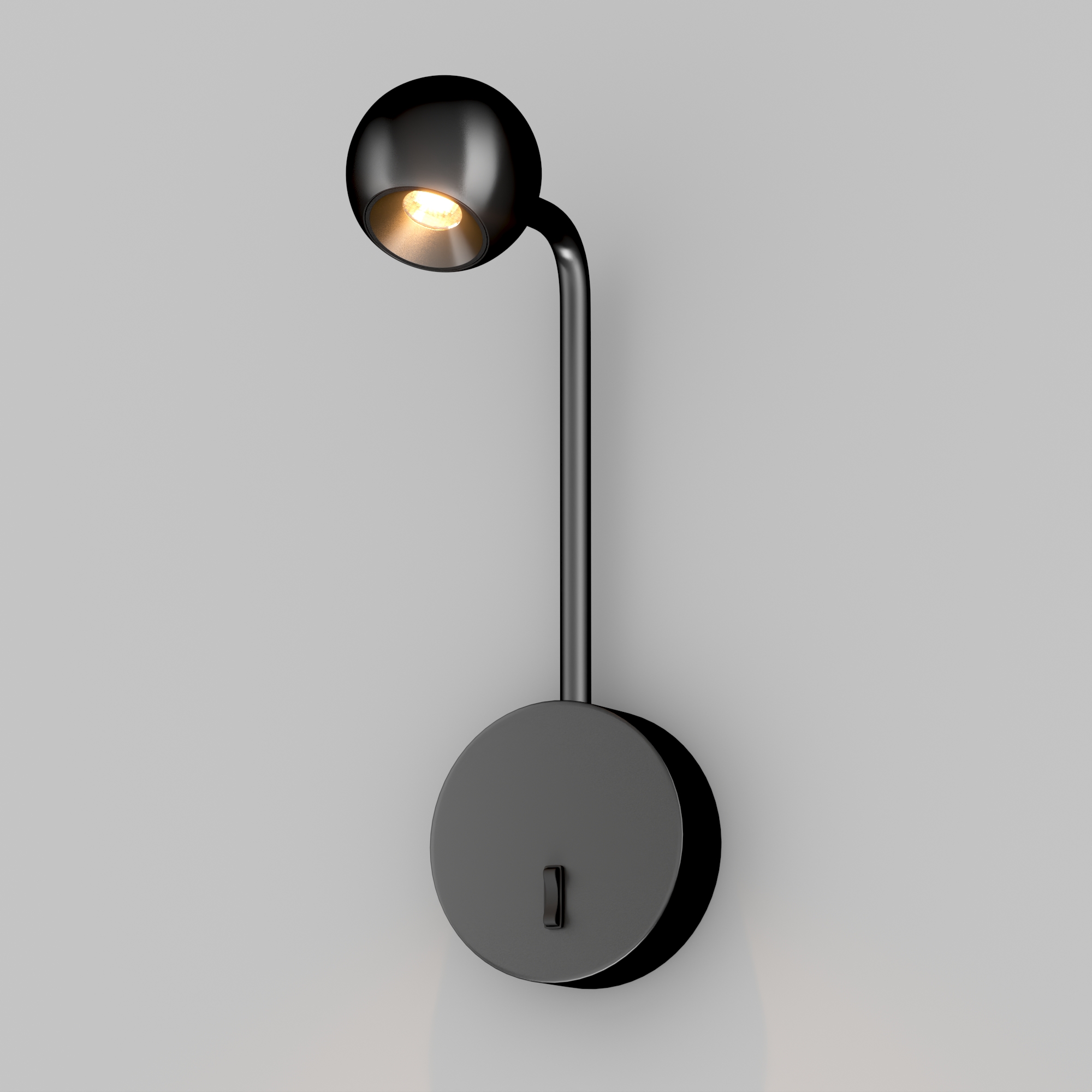 Накладной настенный светильник. Мощность 6 Вт, св. поток 540 лм, 90 лм/Вт, теплый 3000К, CRI>90, угол 30°, напряжение питания 230 В. Черный корпус из алюминия (основание, ножка, светоизлучаль в форме шара), степень защиты IP20. Размер основания Ø100×30 мм, размер ножки Ø12,5×175х72 мм, размер светоизлучателя Ø65×55,5 мм. Драйвер встроенный, пульсация <1%