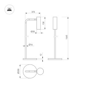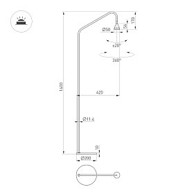 Декоративный напольный светильник. Мощность 5 Вт, св. поток 420 лм, 84 лм/Вт, теплый 3000К, CRI>94, угол 36°, напряжение питания 230 В. Черный корпус из алюминия, степень защиты IP20. Размер основания Ø200×10 мм, диаметр ножки Ø11,4, высота светильника 1400 мм, длина держателя светоизлучателя 420 мм, размер светоизлучателя Ø50×56 мм. Длина провода до выключателя 500 мм, от выключателя к розетке 1500 мм, питание от сети 220-240V. Драйвер 2-10 В, 500 мА, пульсация <1%.