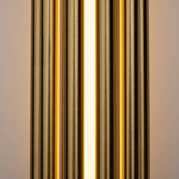 Алюминиевая арматура в двух оттенках: латунь, хром. Мягкий акриловый рассеиватель, плавное распределение света. Декор – металлические трубки в тон арматуре. LED-источник света, цветовая температура 3000К.