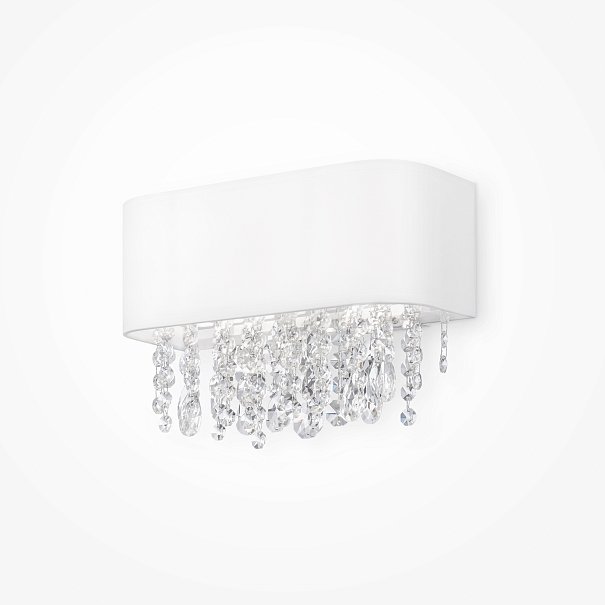 Металлическая арматура в белом цвете. Абажур – ткань, нанесенная на ПВХ, цвет – белый. Декор – подвески в виде граненых кристаллов. Высота подвесных светильников регулируется тросом.