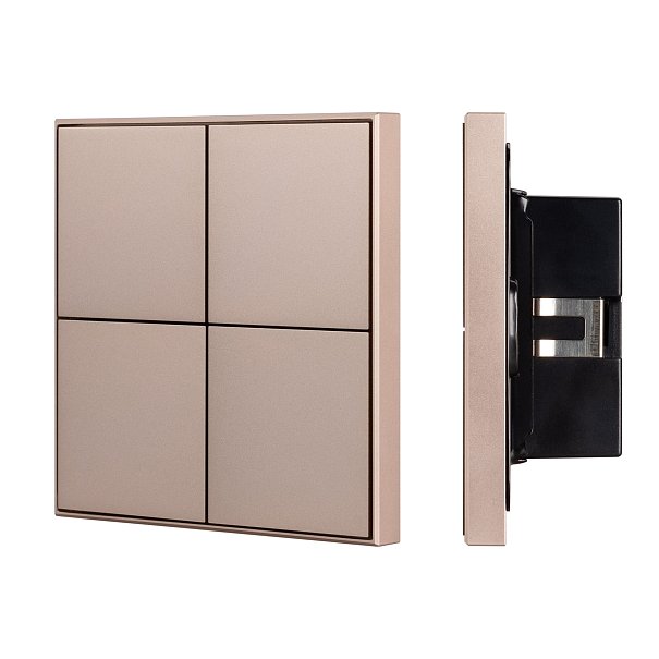 Универсальная многофункциональная встраиваемая настенная панель для систем KNX. 4 рокерные клавиши, 1 клавиша может выполнять функции 2-х клавиш. Тонкая рамка, материал - алюминий, отклик вибрацией, светодиодная индикация. Цвет корпуса - шампань (золото). Питание от шины KNX DC 21-30V. Габариты 86x86x33 мм. Под заказ от 10 штук.