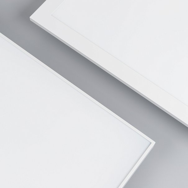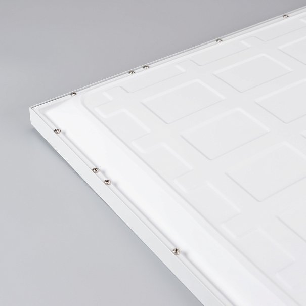 Светодиодная безрамочная панель с прямой засветкой (backlit). Мощность 40 Вт, св. поток 4000 лм, 100 лм/Вт, теплый 3000 K, CRI>90, угол 120°, напряжение питания 230 В. Белый квадратный корпус из алюминия, задняя крышка - сталь, экран PS, степень защиты IP40. Размер: длина 597 мм, ширина 597 мм, высота 38 мм. Монтаж встраиваемый, установочное отверстие длина 575 мм, ширина 575 мм. Драйвер 33-40 В, 1000 мА, пульсация <1%. Панель с рамкой 3,6 мм