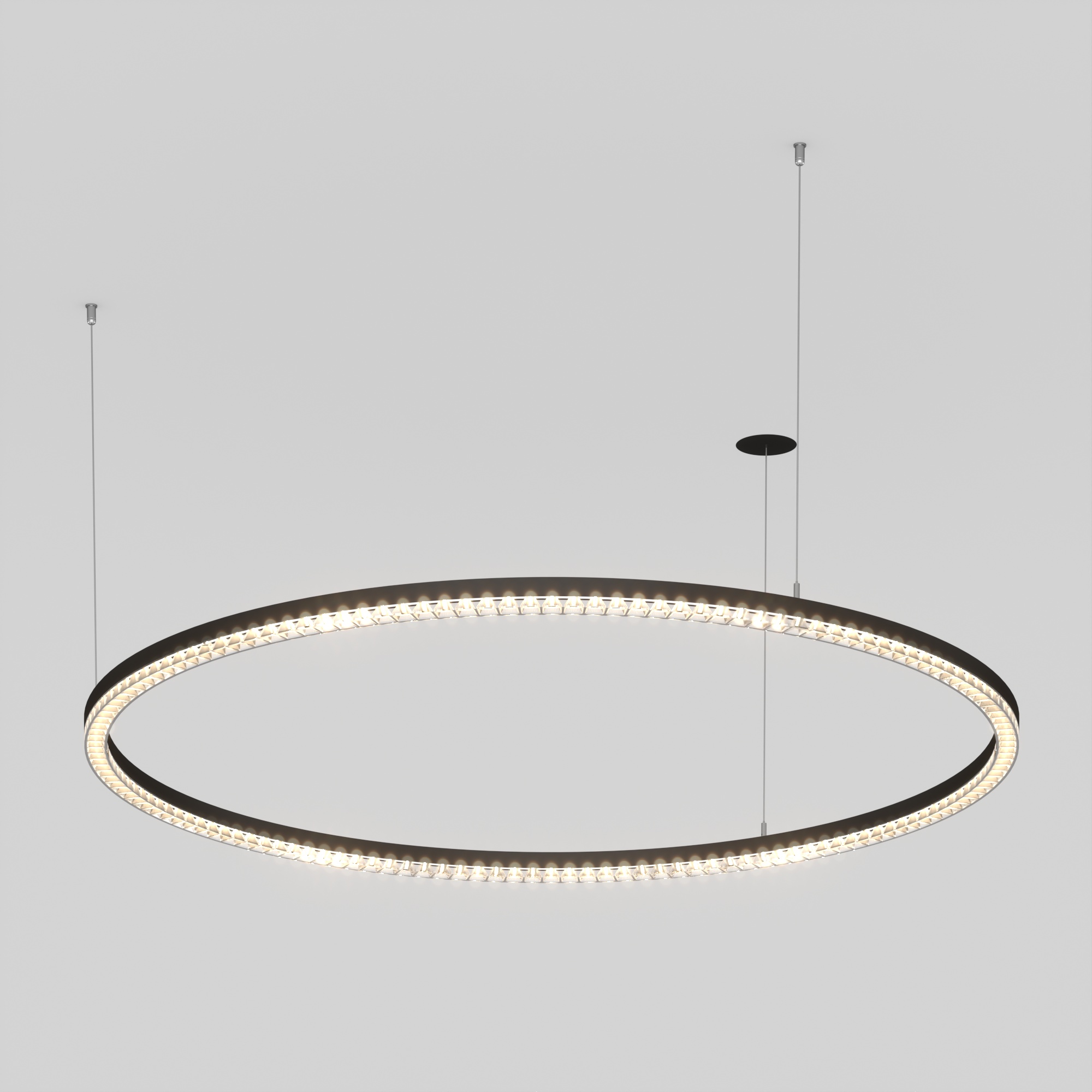 Подвесной светильник. Мощность 80 Вт, св. поток 7010 лм, 80-95 лм/Вт, дневной белый 4000 K, CRI>90, угол 45°, напряжение питания 230 В. Черный круглый корпус из алюминия, экран PMMA, степень защиты IP20. Размер: диаметр 1250 мм, высота 34 мм, ширина профиля 30 мм, размер чаши: диаметр 65 мм, высота 26 мм. Монтаж подвесной, длина подвеса 1200 мм, тип чаши встраиваемый, диаметр установочного отверстия чаши 60 мм. Драйвер (2 шт) 9-38 В, 1050 мА. Пульсация <0,3 %.