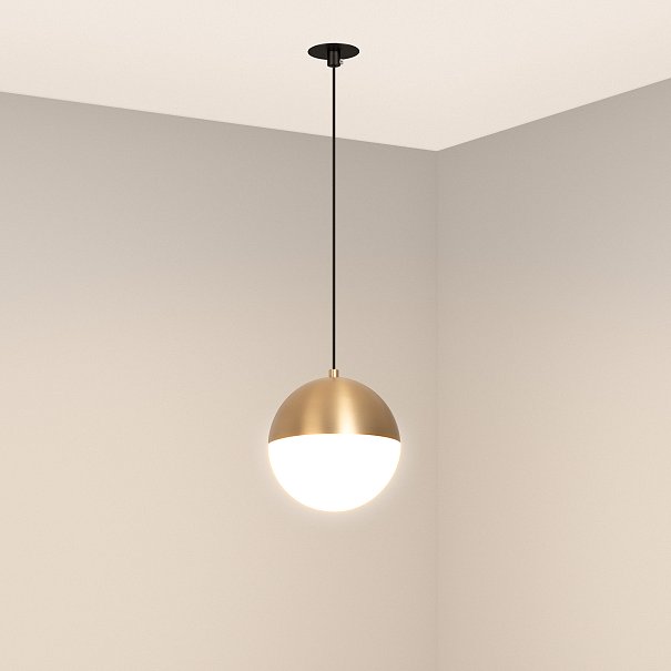 Светильник подвесной. Мощность 11 Вт, св. поток 960 лм, 80 лм/Вт, дневной 4000 K, CRI>90, угол 170°, напряжение питания 230 В. Золотой корпус из алюминия, материал плафона стекло, степень защиты IP20. Размер: диаметр 150 мм, длина подвеса 1500 мм. Потолочная чаша встраиваемая, черного цвета. Размеры Ø 60x40 мм. Размер врезного отверстия Ø 50 мм. Драйвер 28-42 В, 250 мА, пульсация <1%.
