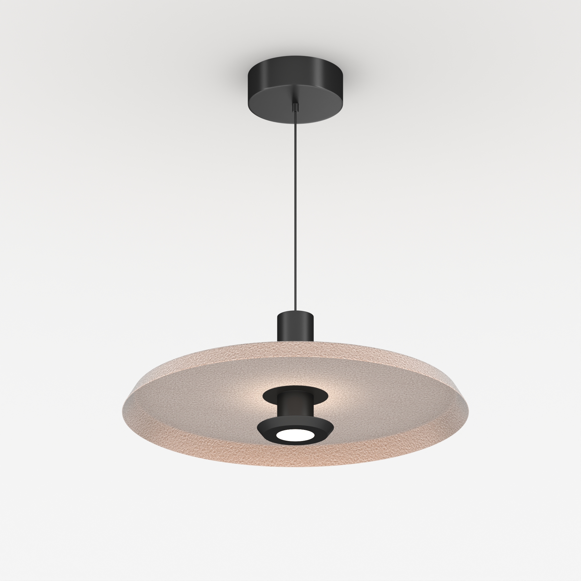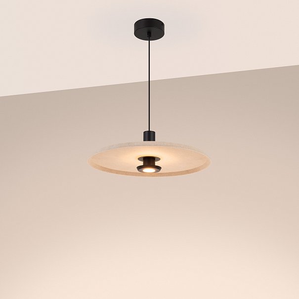 Подвесной светильник. Мощность 12 Вт, св. поток 648 лм, 54 лм/Вт, теплый 2700 K, CRI>94, угол 36°, напряжение питания 230 В. Бежевый фигурный плафон из переработанного фетра с кофейной внутренней поверхностью, линза-рассеиватель из PMMA, степень защиты IP20. Размер: диаметр 450 мм, высота 145 мм. Монтаж подвесной, длина подвеса 2000 мм, регулируемая. В комплекте 2 вида чаш. Габариты чаши (встраиваемая) Ø80 х 23 мм, врезное отверстие Ø60 мм. Габариты чаши (накладная) Ø120 x 35 мм. Драйвер 59В, 300 мА, пульсация <1%. Управление по TRIAC.