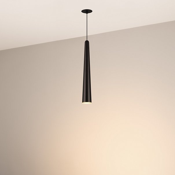 Подвесной светильник. Мощность 5 Вт, св. поток 400 лм, световая эффективность 70 лм/Вт, теплый 3000K, CRI>92, угол 36°, напряжение питания 230 В. Чёрный конусообразный вытянутый корпус из алюминия, линза из PMMA, степень защиты IP20. Размер: диаметр 57 мм, высота 400 мм. Монтаж подвесной, длина подвеса 2000 мм, регулируемая. В комплекте 2 вида чаш. Габариты встраиваемой чаши: Ø 80x41 мм. Габариты накладной чаши Ø80x60 мм. Драйвер 2,8-12В, 500 мА, пульсация <1%.