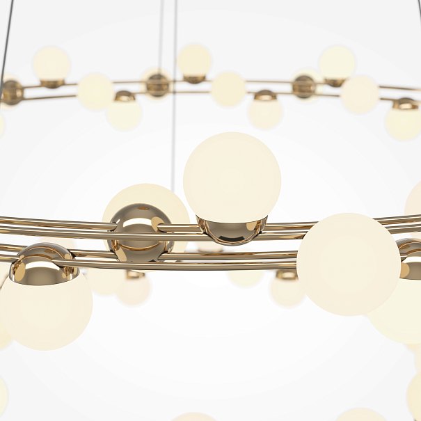 Арматура из металла в золотом цвете. Плафоны-сферы — белый пластик. Дизайн с имитацией молекулярной структуры. LED-источники света.