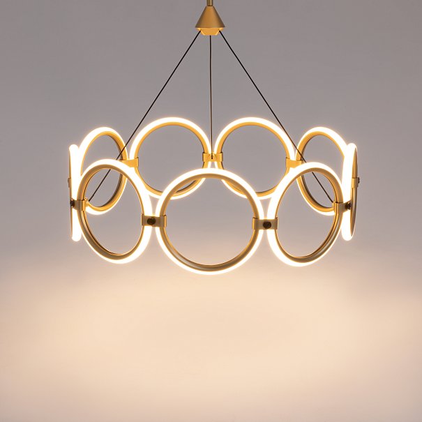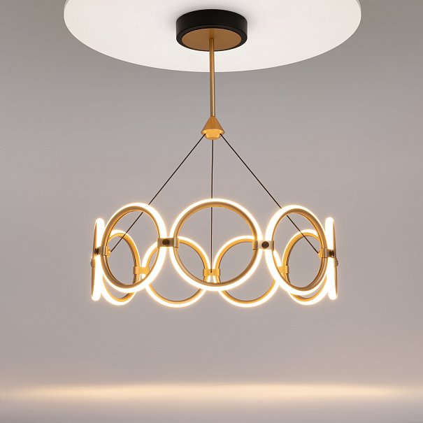 Серия Link представлена подвесными и настенными светильниками с разной вариацией светодиодных колец. Арматура - из металла в цвете латунь с чёрными элементами. Источник света — LED-кольца. Цветовая температура — 3000 K. Угол рассеивания — 125 градусов. Провод регулируемый, 3 метра.