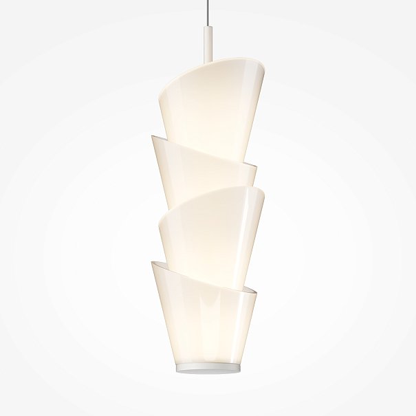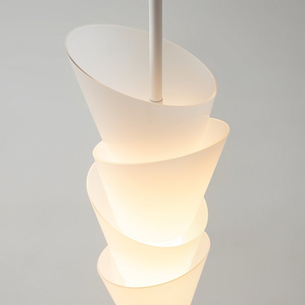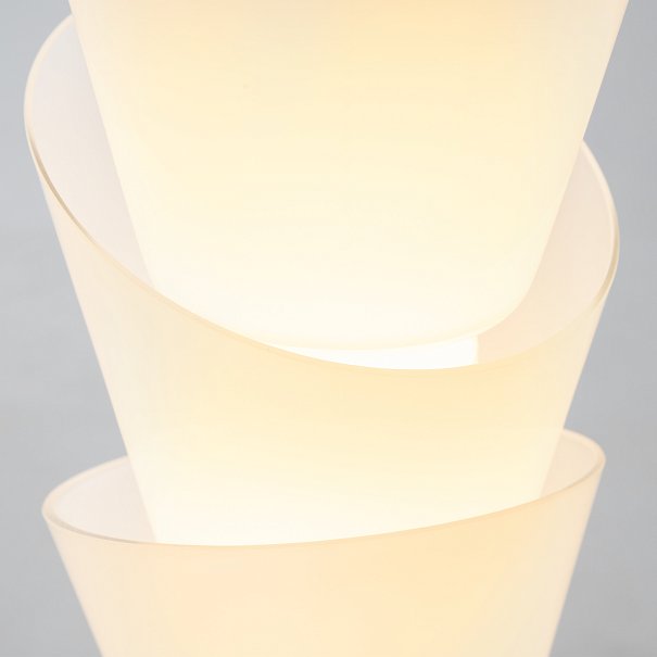 Многогранный светильник-трансформер. Возможность изменения дизайна путем поворота стеклянных плафонов. Цвет арматуры — белый. Материал арматуры — металл. LED-источник света с многоуровневым матовым рассеивателем. Конструкция с вращающимися элементами из белого эмалированного стекла. Шестиугольное основание со светодиодными платами для мощного равномерного освещения. Регулируемая высота подвеса и провод длиной 3 метра для адаптации к высоким потолкам.