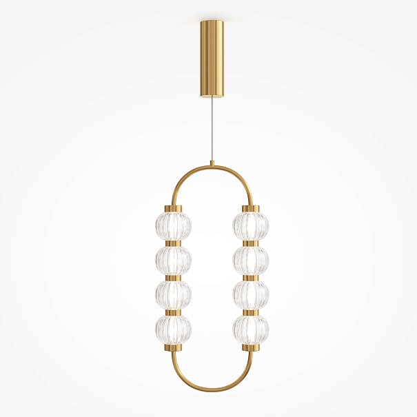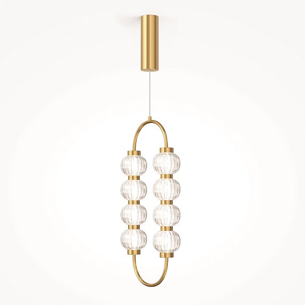 Арматура из металла, цвет – хром. Акцентный декор в виде рельефных сфер из литого стекла. Источник света – светодиодная лента – скрыта под акриловым рассеивателем. Регулируемая высота подвесных светильников.