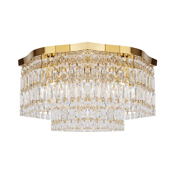 Металлическая арматура в двух оттенках: хром, золото. Декор – прозрачные кристаллы. Потолочные модели имеют два яруса подвесок. Высота подвесной люстры регулируется тросом.