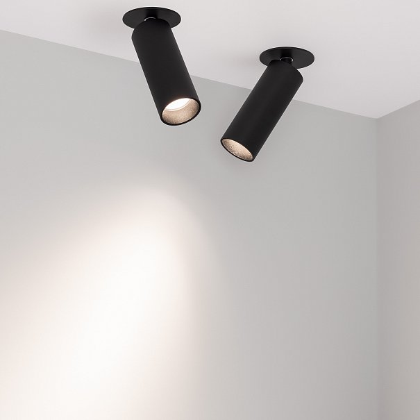 Светильник встраиваемый откидной. Мощность 7 Вт, св. поток 580 лм, 82 лм/Вт, дневной 4000 K, CRI>90, угол 36°, напряжение питания 230 В. Черный круглый корпус из алюминия, экран PMMA, степень защиты IP40. Размер: диаметр 35 мм, высота светового модуля 90 мм, высота основания 1.5 мм. Угол поворота 350°, угол наклона 90°. Монтаж встраиваемый, установочное отверстие: диаметр 45 мм, глубина 29 мм. Драйвер в комплекте 30-40 В, 150 мA, пульсация <1%.