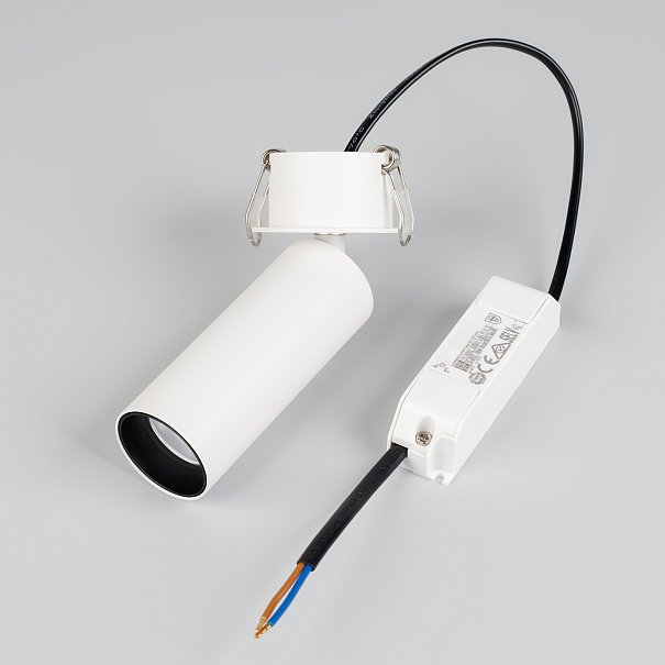 Светильник встраиваемый откидной. Мощность 7 Вт, св. поток 490 лм, 70лм/Вт, теплый 3000 K, CRI>90, угол 36°, напряжение питания 230 В. Белый круглый корпус из алюминия, экран PMMA, степень защиты IP40. Размер: диаметр 35 мм, высота светового модуля 90 мм, высота основания 1.5 мм. Угол поворота 350°, угол наклона 90°. Монтаж встраиваемый, установочное отверстие: диаметр 45 мм, глубина 29 мм. Драйвер в комплекте 30-40 В, 150 мA, пульсация <1%.