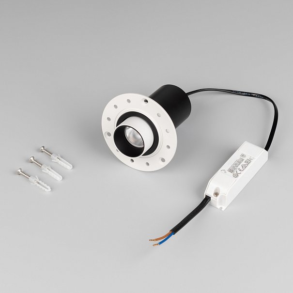 Светильник встраиваемый поворотный. Мощность 7 Вт, св. поток 490 лм, 70 лм/Вт, теплый 3000 K, CRI>90, угол 36°, напряжение питания 230 В. Белый круглый корпус из алюминия, экран PMMA, степень защиты IP40. Размер: диаметр 35 мм, высота светового модуля 65 мм. Угол поворота 360°, угол наклона 90°. Монтаж встраиваемый, установочное отверстие: диаметр 55 мм, глубина 73 мм. Драйвер в комплекте 27-50 В, 150 мA, пульсация <1%.
