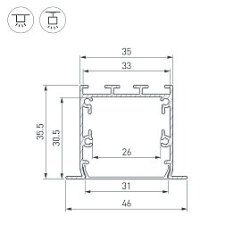 Встраиваемые модели профиля используются для получения линий света вровень с поверхностью, на которой они расположены. Профиль устанавливается в специально подготовленный паз. Модели с фланцем помогут скрыть неровные края монтажного отверстия, а модели для скрытого монтажа получить линии света без видимых частей профиля. Может применяться как для основного освещения, так и для декоративной подсветки.