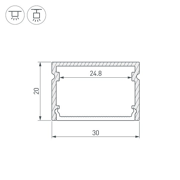 Алюминиевый анодированный накладной профиль для светодиодных лент и линеек. Габаритные размеры (L×W×H): 2000x30x20 мм. Ширина площадки для ленты 24,8 мм. Экраны, заглушки и другие аксессуары приобретаются отдельно. Цена за 1 метр.