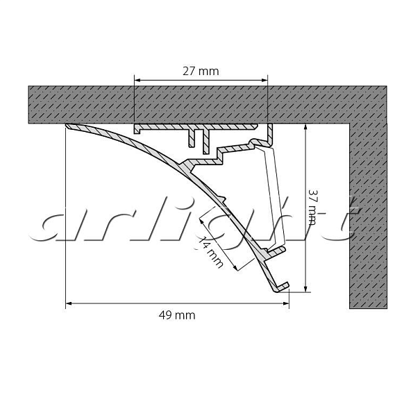 Алюминиевый анодированный профиль для подсветки стен и потолков. Состоит из двух частей - основания и профиля для светодиодной ленты. Габаритные размеры (L×W×H): 2000x49x37 мм. Ширина площадки для ленты 14 мм. Экраны, заглушки и другие аксессуары приобретаются отдельно. Скобы для соединения двух частей профиля идут в комплекте (3 шт на 2 м.). Цена за 1 метр.