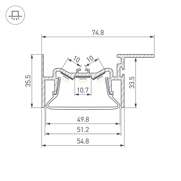 Алюминиевый профиль для натяжных потолков (боковая линия - монтаж к потолку). Решение 2-в-1 - каркас для крепления натяжного потолка и профиль для установки светодиодной ленты. Для дизайнерских решений «линии света» в натяжных потолках. Монтируется к потолку, накладной способ. Натяжной потолок крепится к профилю с одной стороны. Габаритные размеры (L×W×H): 2000x75x36мм. Ширина центральной площадки для ленты 11мм, боковых площадок - 10 мм. Экраны, заглушки и другие аксессуары приобретаются отдельно. Цена за 1 метр.
