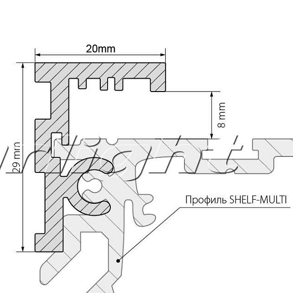 Фиксирующий анодированный профиль для стекла 8мм к профилю SHELF-MULTI, для создания полок и подставок на основе профиля SHELF-MULTI. Размеры 2000х20х29 мм.