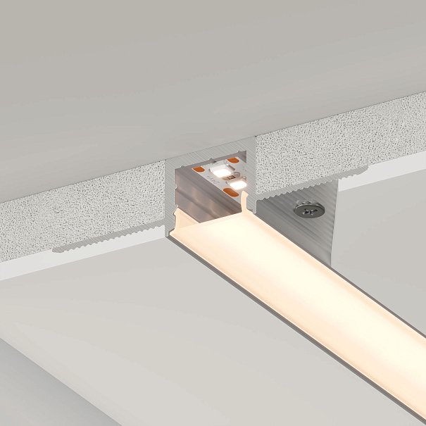 Алюминиевый анодированный профиль для светодиодных лент и линеек. Скрытая установка (под строительную отделку). Габаритные размеры (L×W×H): 2000x55,8x13 мм. Ширина площадки для ленты 12,5 мм. Экраны, заглушки и другие аксессуары приобретаются отдельно. Цена за 1 метр.