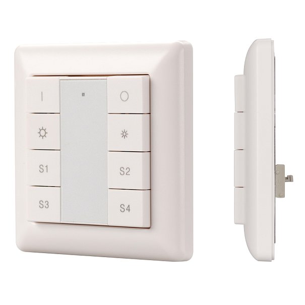 Встраиваемая кнопочная белая пластиковая панель для работы по протоколу DALI. Включение/выключение, диммирование, вызов и сохранение 4-х сцен в 1 группе. Установка номера группы и номера первой сцены выполняется переключателями на корпусе. Питание от шины DALI (4 мА). Стандартная рамка входит в комплект поставки.