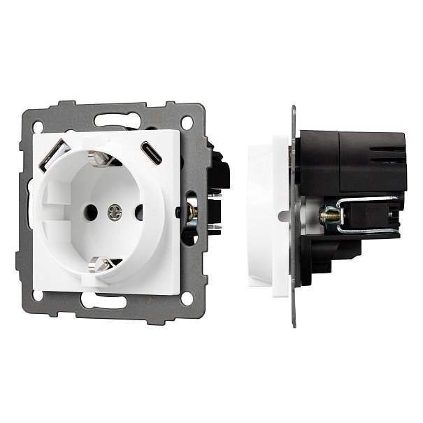 Механизм розетки с заземлением 1 пост 2 USB Type A+C порта. Цвет - белый. Без фронтальной рамки. Уровень пылевлагозащиты IP20. Устанавливается в стандартный подрозетник. Габаритные размеры: длина 71 мм, ширина 71 мм, высота 53 мм. Гарантийный срок 10 лет.