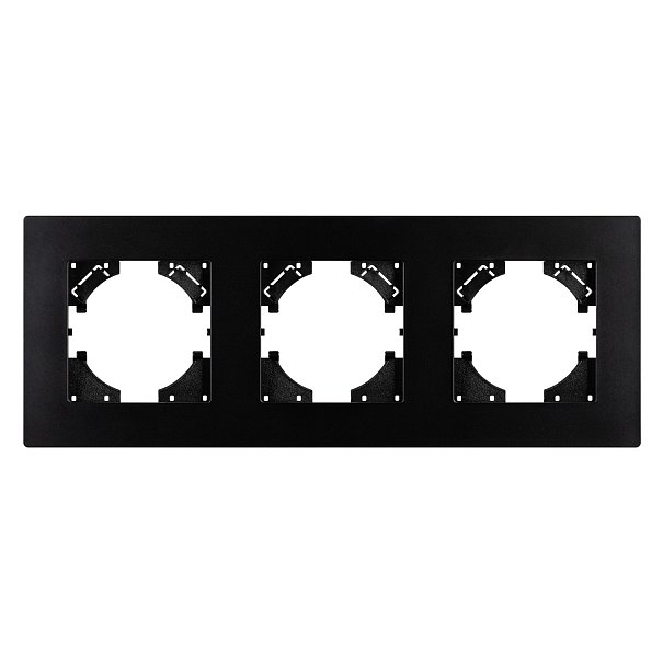 Рамка пластиковая на 3 поста, под встраиваемый механизм. Цвет - черный. Среднего уровня герметичности IP20. Ориентация монтажа - горизонтальная (основным ориентиром служат посадочные выступы для накладки механизма). Габаритные размеры: длина 228 мм, ширина 86 мм, высота 7 мм. Гарантийный срок 12 мес.