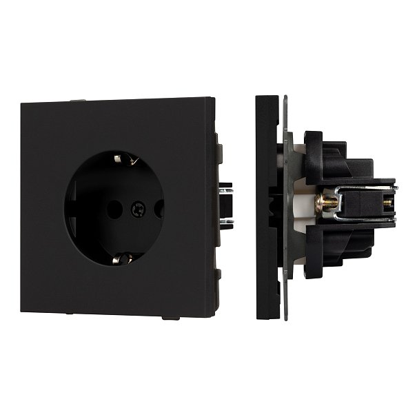 Механизм розетки с заземлением на 1 пост. Цвет - черный, с Soft-Touch покрытием. Без фронтальной рамки. Уровень пылевлагозащиты IP20. Розетка устанавливается в стандартный подрозетник круглого сечения диаметром 60мм. Габаритные размеры: длина 71 мм, ширина 71 мм, высота 44 мм. Гарантийный срок 10 лет.