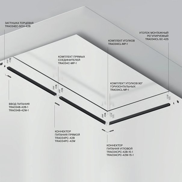 Комплектующие для низковольтной магнитной трековой системы Exility в черном и белом цветах. Разнообразие аксессуаров позволяет собрать свою уникальную конструкцию для накладного монтажа, подвесного, встраиваемого под гипсокартон и встраиваемого в натяжные потолки.