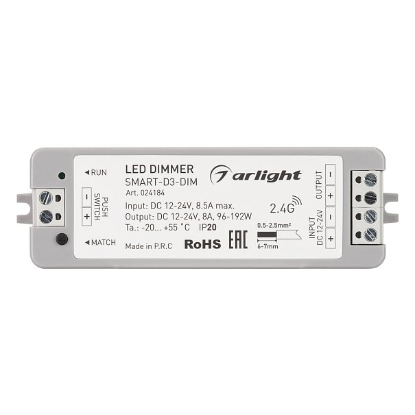Диммер для монохромной светодиодной ленты (ШИМ). Питание/рабочее напряжение 12-24VDC, максимальный ток 8A на канал, 1 канал, максимальная мощность 96-192W. Винтовые клеммы. Корпус - PVC. Габариты 97x33x18 мм. Управляется пультами и панелями серии SMART (поставляются отдельно).